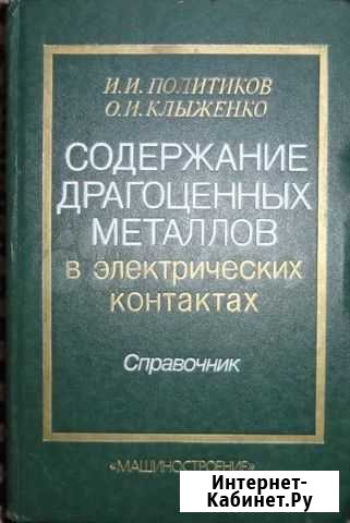 Политиков И.И, Клыженко О.И. "Содержание драгоценных металлов в электрических контактах. Справочник " Твердый переплет, 540 страниц. М.: Машиностроение 1991 год Приведены теоретические массы электрических контактов из драгоценных металлов и их сплавов. 1128 типоразмеров. Состояние: б/у.