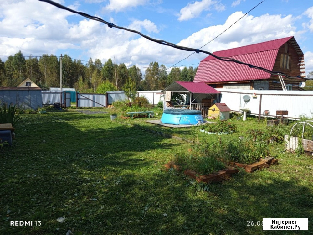 Продаётся садовый участок в семи км от Екатеринбурга. Есть электричество, своя скважина, небольшой дом из бруса. Имеются фруктовые и ягодные насаждения (яблони, вишни, тёрн, облепиха, смородина, крыжовник, жимолость, малина, клубника), грядки для овощей, многолетние цветы и зелёный газон.