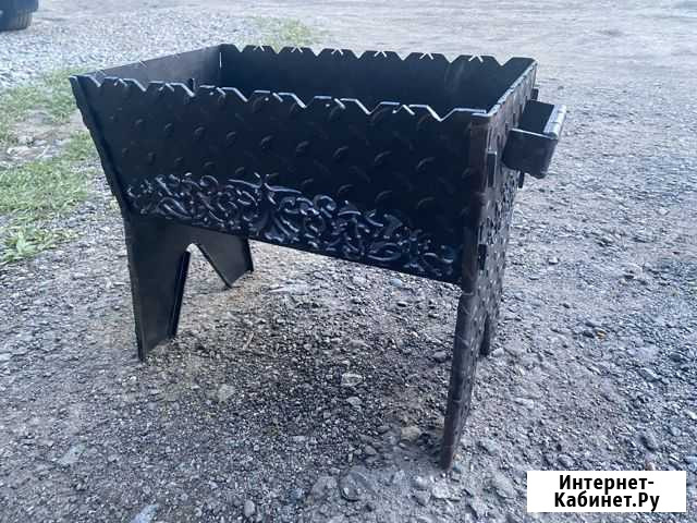 Мангал Рубиной работы из стали 3мм. Отличный подарок как для себя, так и для хорошего друга. Новый. Надежный.Разборный. Компактный (идеально подойдёт для решетки стандартного размера). Со съёмными ручками! Размеры: длина- 400, ширина-250, глубина 165, высота 350. Все размеры есть на фото! Состояние: новое.спорт и отдых