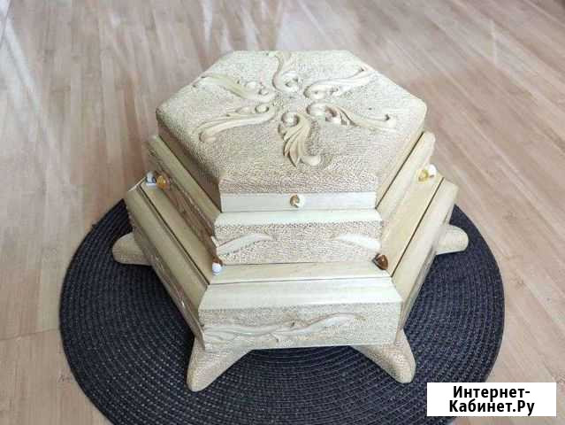 Шкатулка двухъярусная, из массива дерева, украшена янтарем. Отделка внутри - черный бархат. Есть 1 дефект - потерялся один янтарик. Состояние: б/у.мебель и интерьер