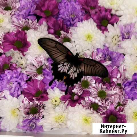 Уникальный подарок, который не сможет не удивить. Настоящая живая тропическая бабочка в подарочной коробке, выполненной в виде ковра из живых цветов Стоимость зависит от оформления. Состояние: б/у.