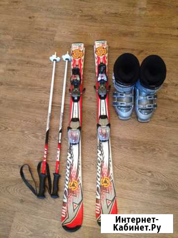 Лыжи в идеальном состоянии, ботинки , носы чуть потёрты, 22,5-23,5 размер. (российский 34,5-36.)Есть и шлем. Подходит для ребёнка 7-9 лет. Состояние: б/у.спорт и отдых