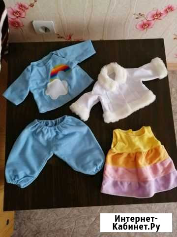 Новая, качественная одежда для кукол, пупсов: 1) Платье, повязка-наушники, носочки 250 р. 2) Костюм из кофты и штанов 200 р. 3) Платье и курточка 230 р Стоимость указана за один костюм. Так же, вы можете приобрести одежду поштучно из комплектов. Если берёте несколько штук, будет скидка. Стоимость за все костюмы 550 рублей. Есть доставка, пишите, договоримся) Длина вещей: Оранжевое платье-27 см Шубка-17 см Голубые штаны-20 см Голубая кофта-17 см Платье в полоску-20 см Состояние: новый.товары для детей и игрушки