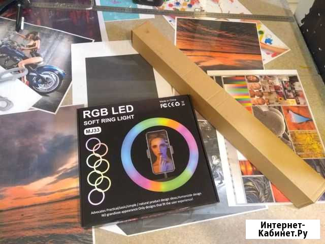 Новая кольцевая RGB лампа. Диаметр 33см. Штатив в комплекте. Качественные крепления и регулировки, проводной пульт. Подключение по USB в любой блок питания. 3 держателя для устройств. Помимо цветных режимов, светит тремя режимами белого. Шикарно для фотосъёмки, в том числе вне дома, т.к. павербанк легко её тянет. Состояние: новое.фототехника