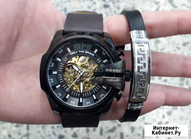 ? Часы Diesel Механические  - ----------------------------------------------------------------- ? Гарантийный срок 1 год на часы кварцевые Дизель ? Доставка по СПб ( курьером ) ? коробочка в ПОДАРОК + Браслет ? БЕСПЛАТНАЯ ДОСТАВКА ------------------------------------------------------------------ Преимущества мужских наручных часов : ? Стильный и красивый дизайн часов ? Комфортно и удобно носить ( не натирают ) ? Циферблат показывает : секунды, минуты, часы и дату ___________________________________________________ Характеристики наручных часов : - Ремешок : кожа - Материал : металл - Стекло : минеральное ударопрочное - Часы : Механика ___________________________________________________ ?? Звоните или пишите Состояние: новое.часы и украшения