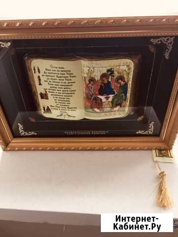 Панно оберег молитва «Отче наш» в виде объемной развёрнутой книги. На одной странице молитва на другой икона «Святая Троица» Рублева. Оформлено в бокс под стеклом. Очень оригинально выполнено. «Отче наш» известная христианская молитва встанет на защиту Вашего дома. Оберег замечательный подарок на новоселье, или любой другой праздник. Новая. Размер 36*26*5 Состояние: новое.мебель и интерьер