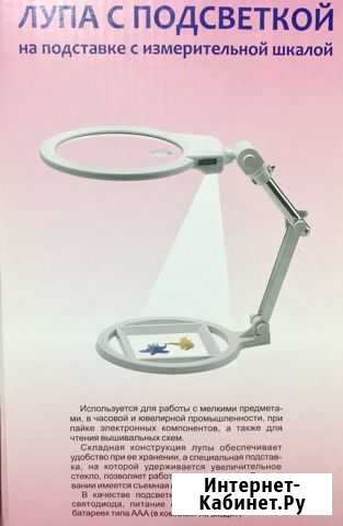 Лупа с подсветкой на подставке с измерительной шкалой. Используется для работы с мелкими предметами, а так же для чтения вышивальных схем. Складная конструкция лупы обеспечивает удобство при ее хранении, а специальная подставка, на которой удерживается увеличительное стекло, позволяет работать двумя руками. В основании имеется съемная измерительная шкала. В качестве подсветки используются 2 ярких светодиода, питание от трёх батареек типа ААА (в комплект не входят). Состояние: новое.красота и здоровье