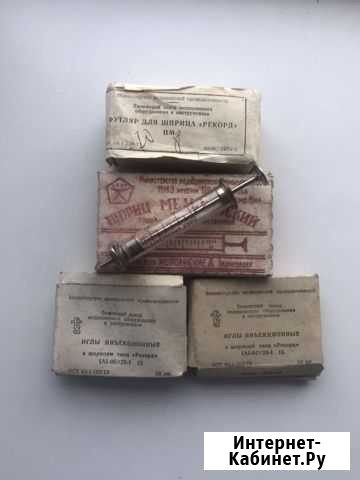 Шприц «Рекорд» 5 мл с двумя сменными колбами. Футляр для шприца «Рекорд». Иглы для шприца типа «Рекорд» двух размеров. Всего 5 упаковок по 10 штук. Все новое. 1979 год выпуска. Состояние: новое.коллекционирование